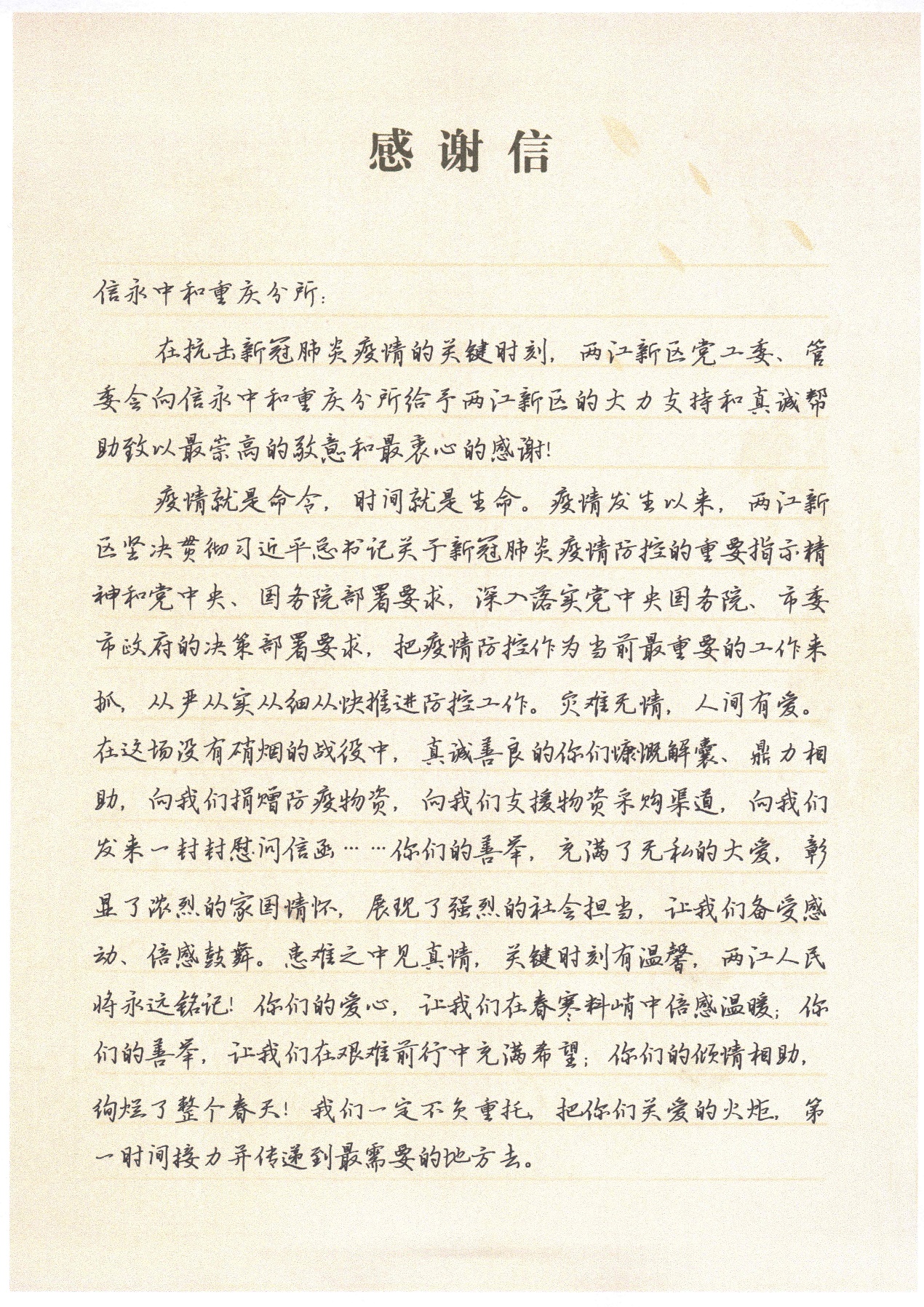 2月25日,信永中和重庆分所收到来自重庆市委常委、两江新区党工委书记、管委会主任、两江新区新冠肺炎防控总指挥部总指挥长段成刚,以及两江新区党工委副书记、管委会常务副主任、两江新区新冠肺炎防控总指挥部执行总指挥长王志杰的感谢信,感谢信永中和重庆分所为两江新区的疫情防控捐赠价值18万元物资的善举和鼎力相助。
